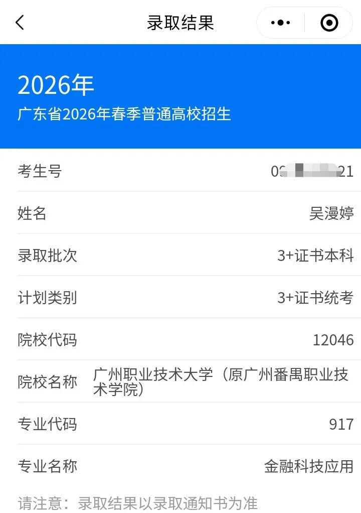 2026年“3+证书”高考,高州市信息职业技术学校吴漫婷同学以文化总分397分、技能测试91.33分、综合总分397.894分的优异成绩,被公办本科院校——广州职业技术大学录取。这意味着什么?面对20万考生,全省仅10个名额,而她凭借扎实的文化功底和过硬的专业技能,从众多考生中脱颖而出,确实是许多同学想也不敢想的事情。